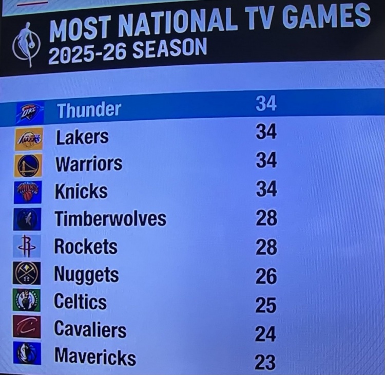 8月15日讯 今日NBA公布新赛季完整赛程,据统计,新赛季湖人、勇士、雷霆和尼克斯并列全美直播比赛数量最多,均为34场,森林狼与火箭均为28场,并列排名第二多。